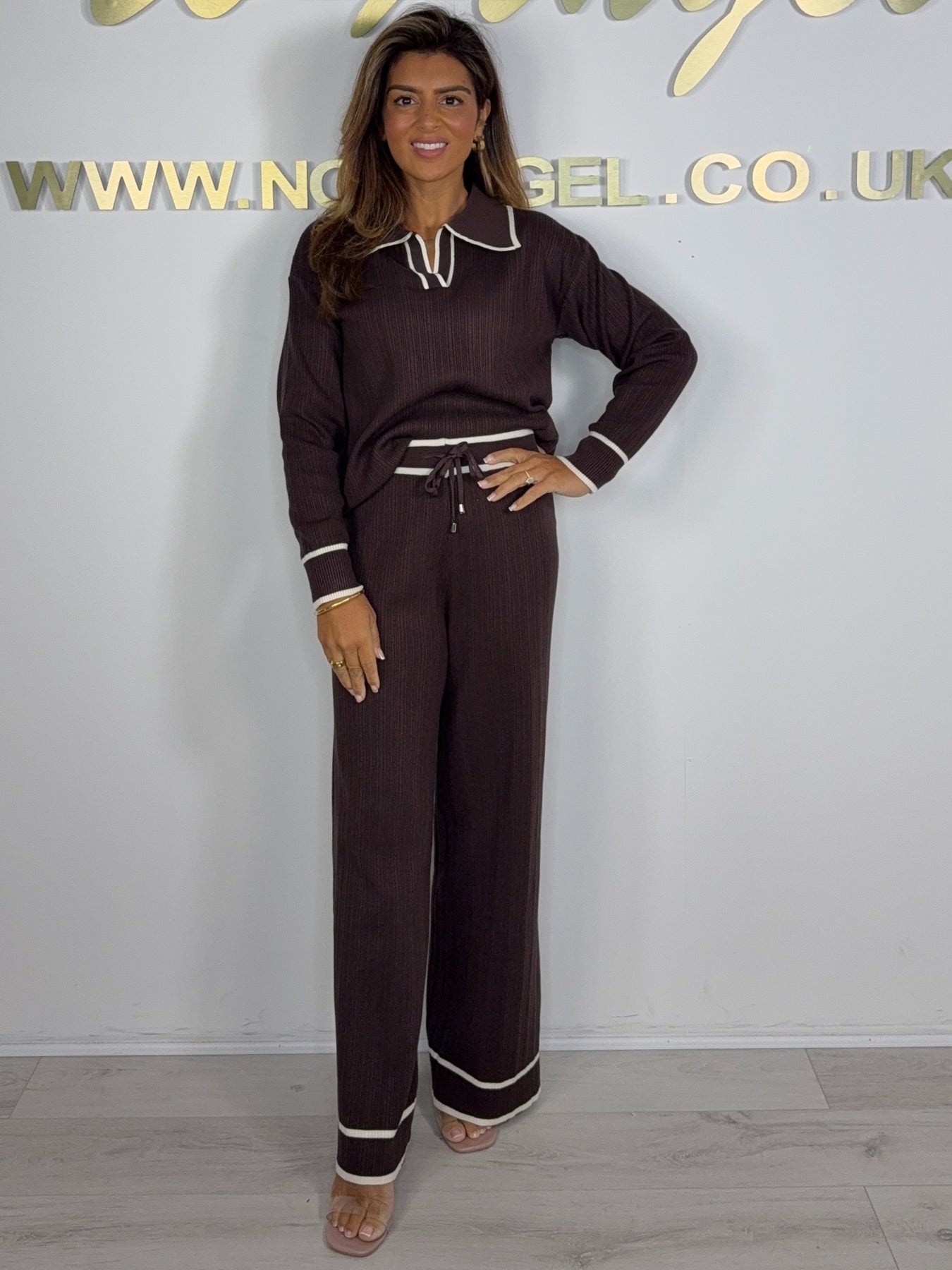 Brown Collared Cream Trim Detail Trouser Co-ord