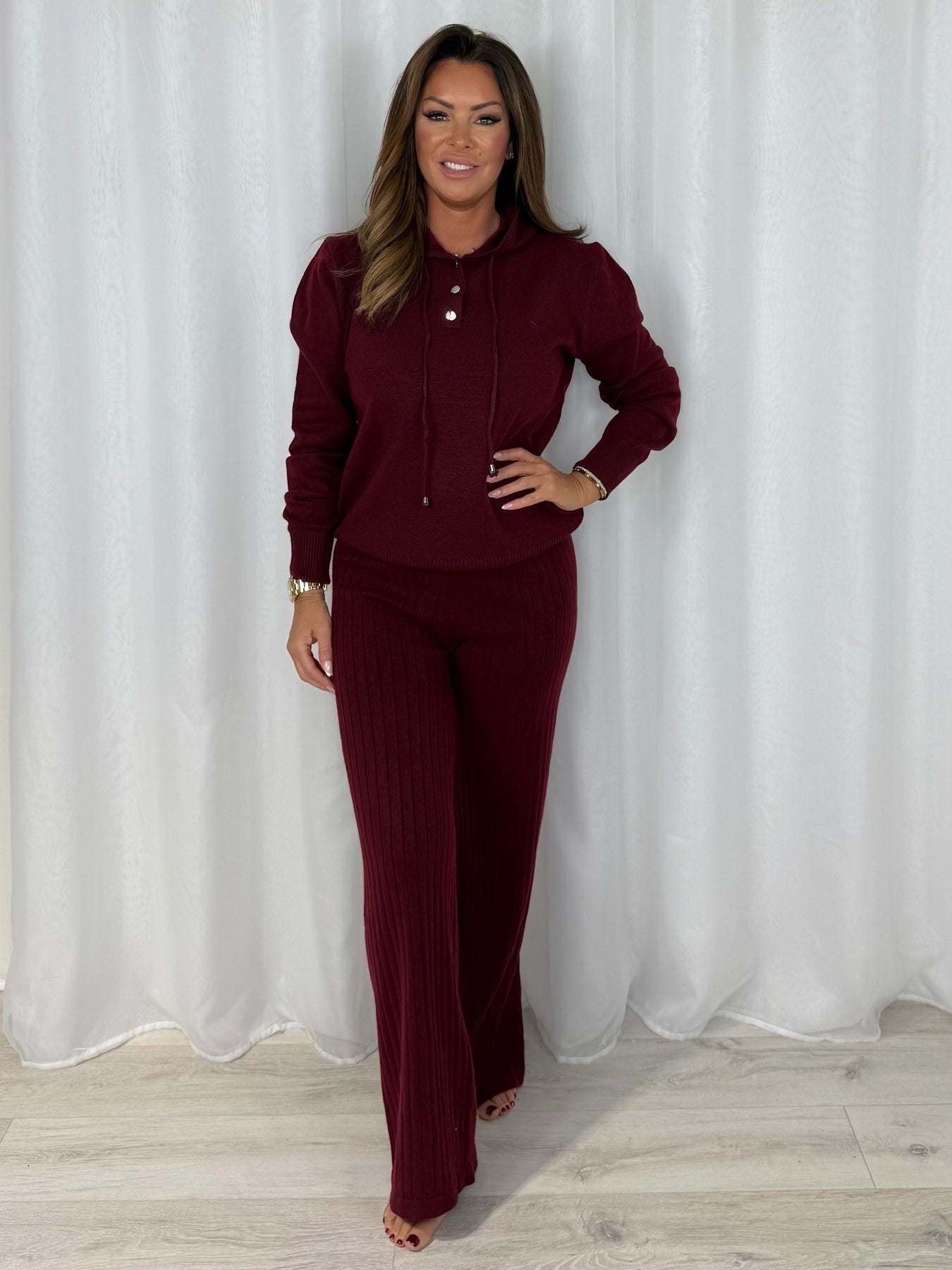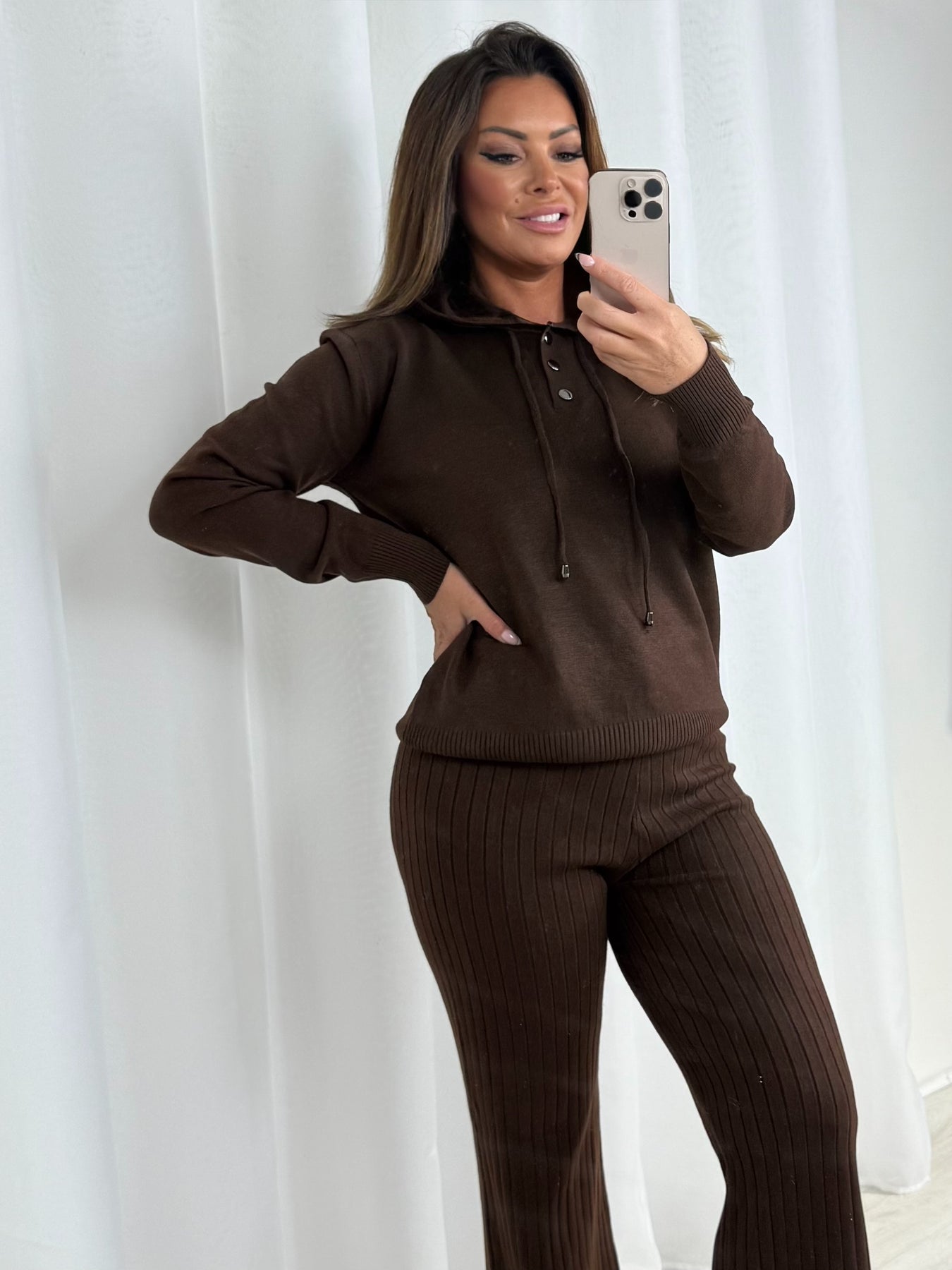 Button Hooded Drawstring Ribbed Jumper & Trouser Co-Ord