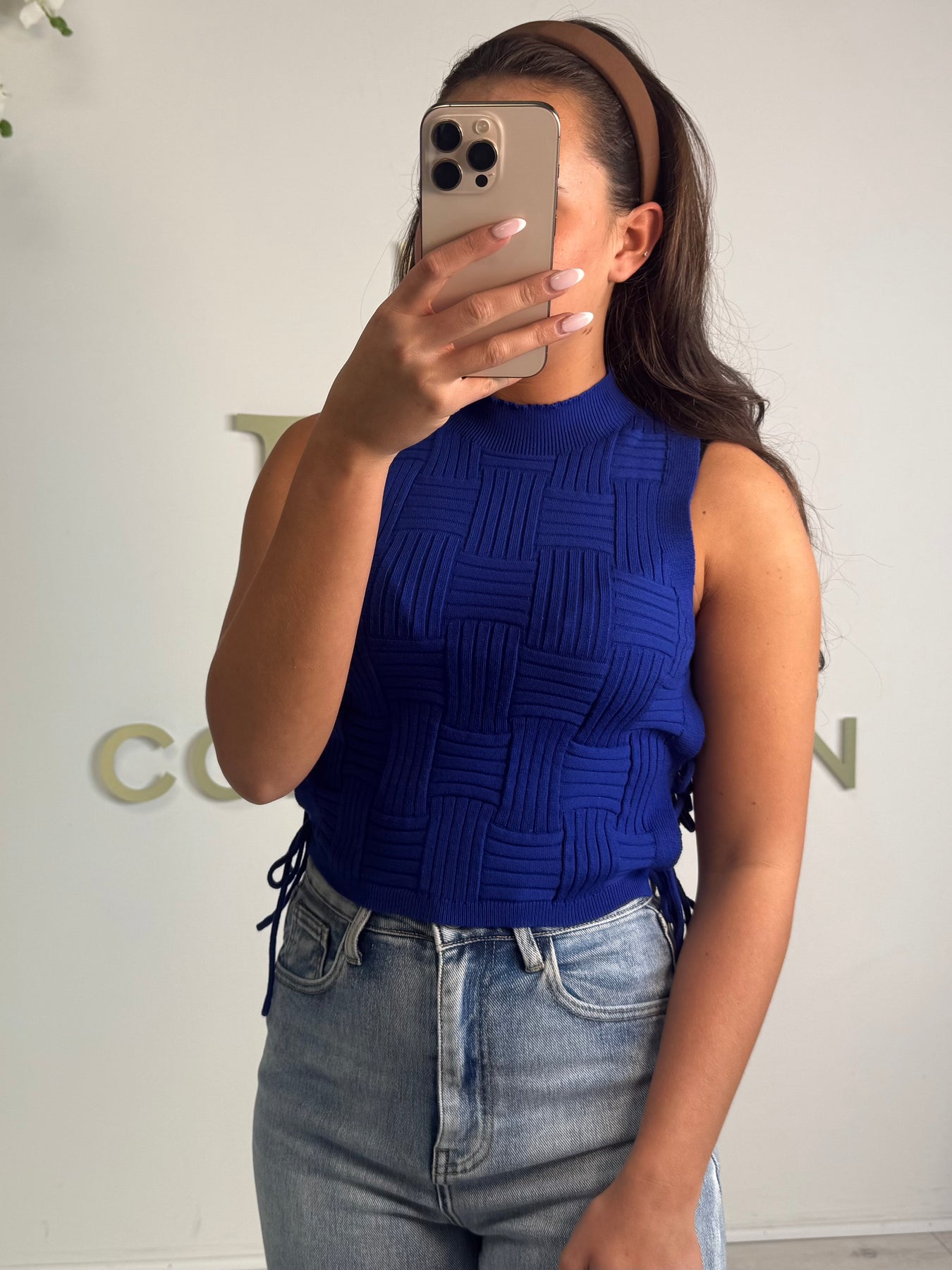 Royal Blue Woven Look Turtle Neck Tie Side Top