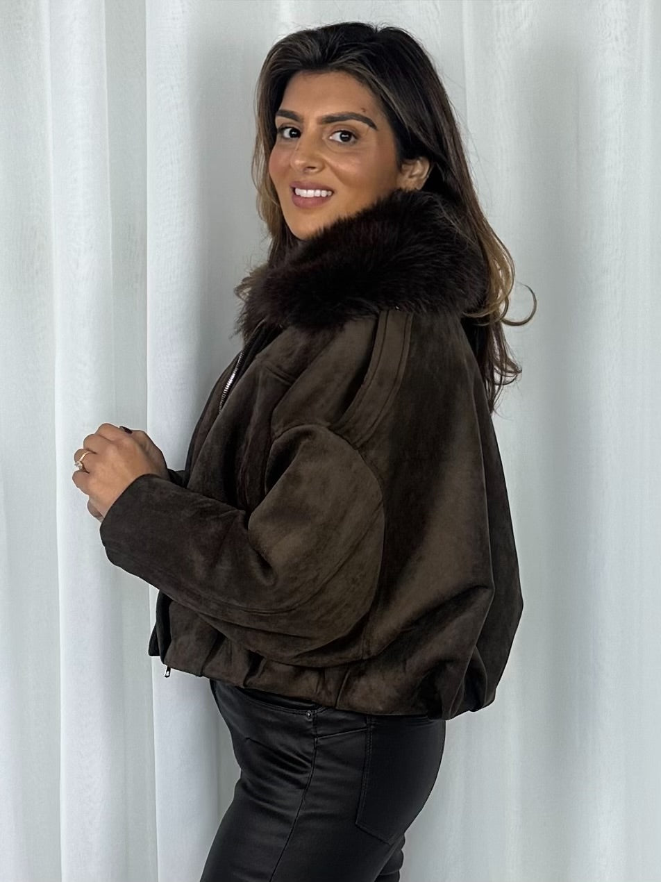 Brown Faux Suede Fur Collar Bomber Jacket