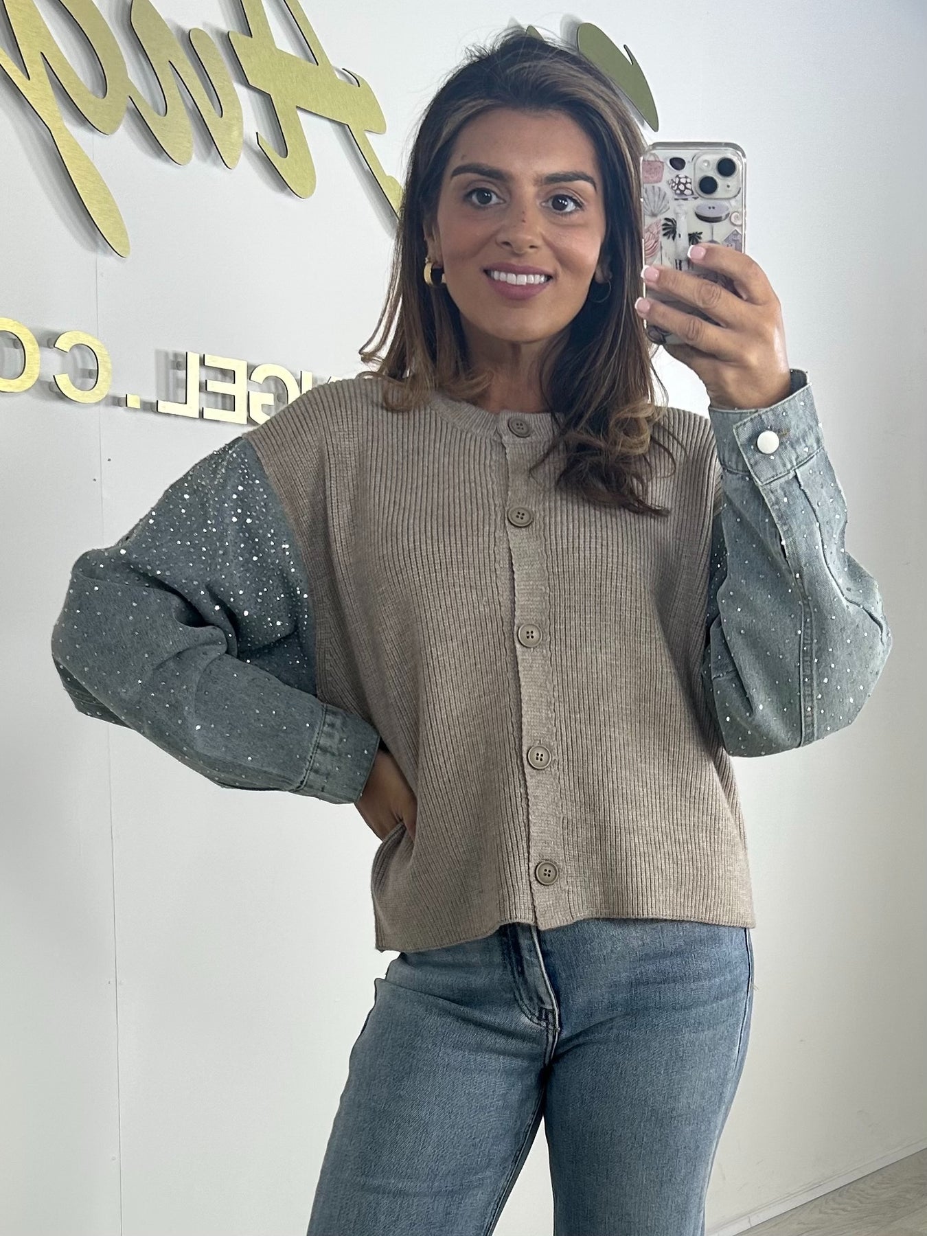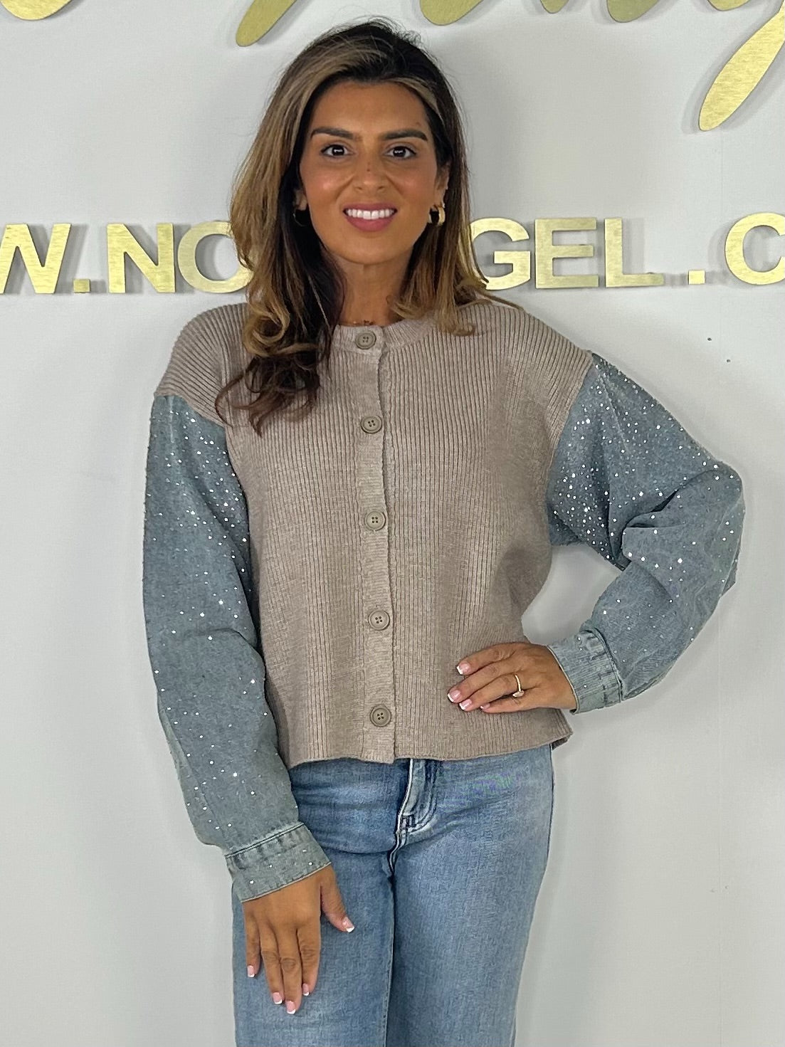 Button Up Knit Diamante Denim Sleeve Cardigan