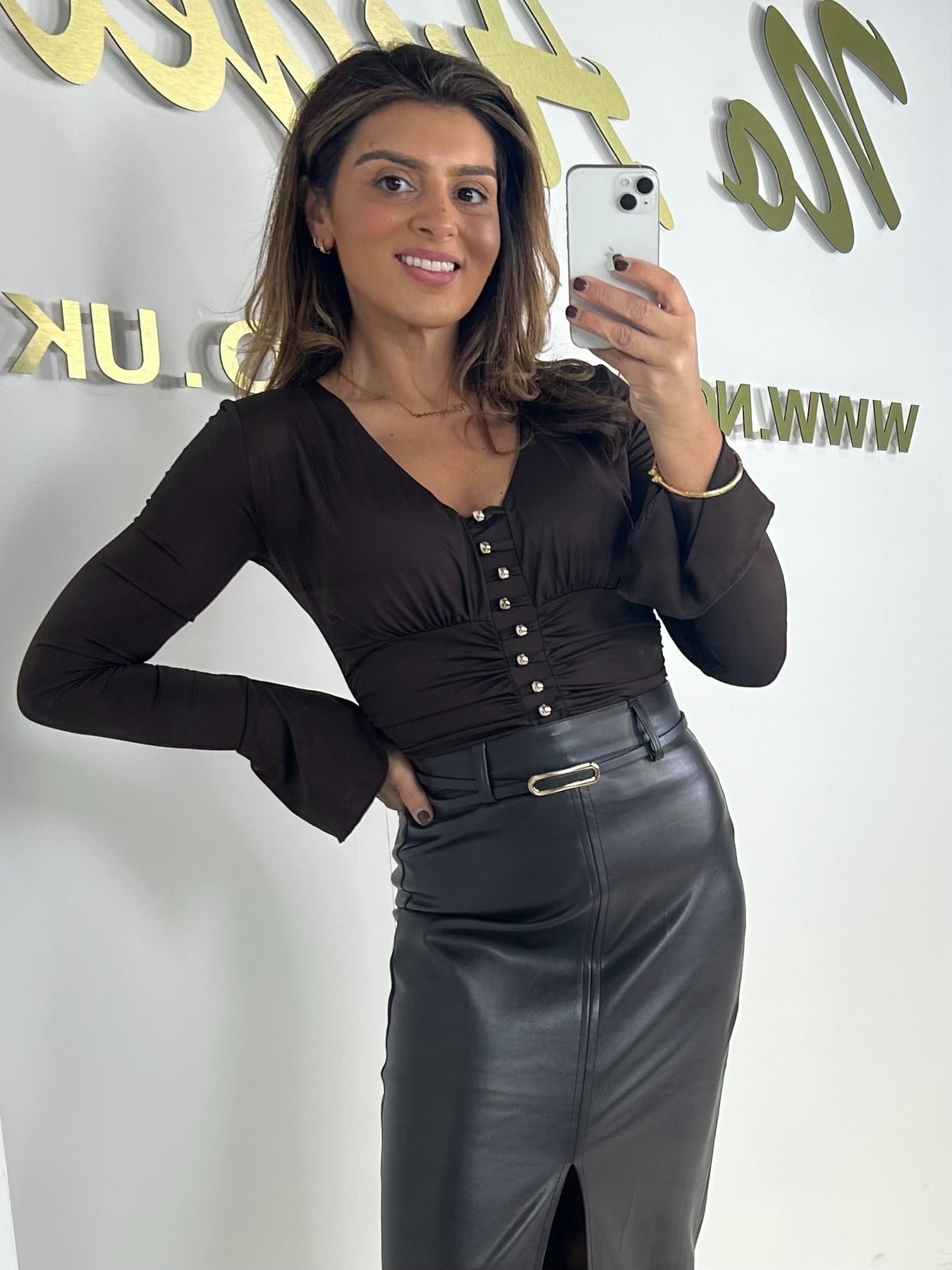Brown Bell Sleeve Gold Button Detail Bodysuit