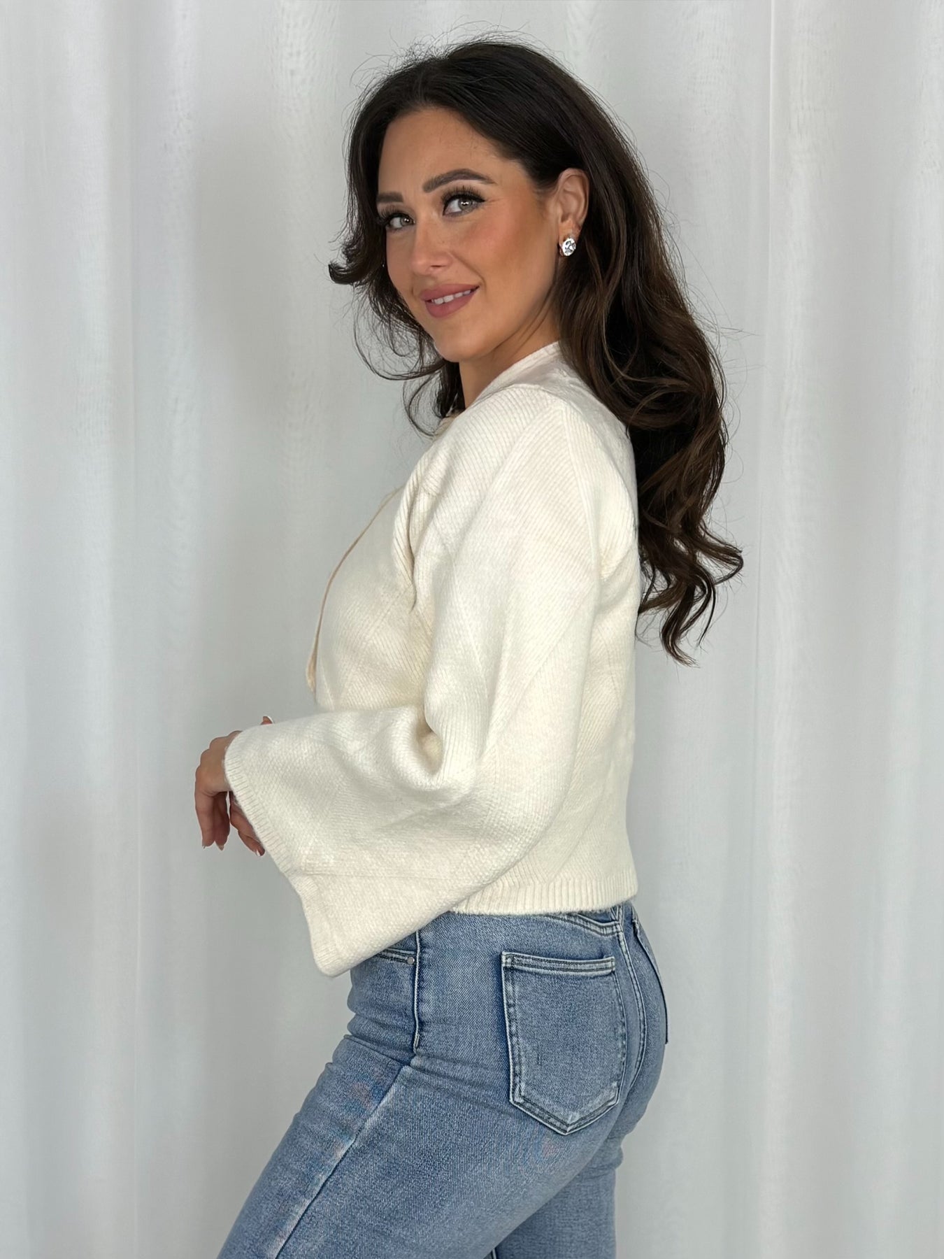 Soft Knit Covered Button Cropped Diamond Print Cardigan